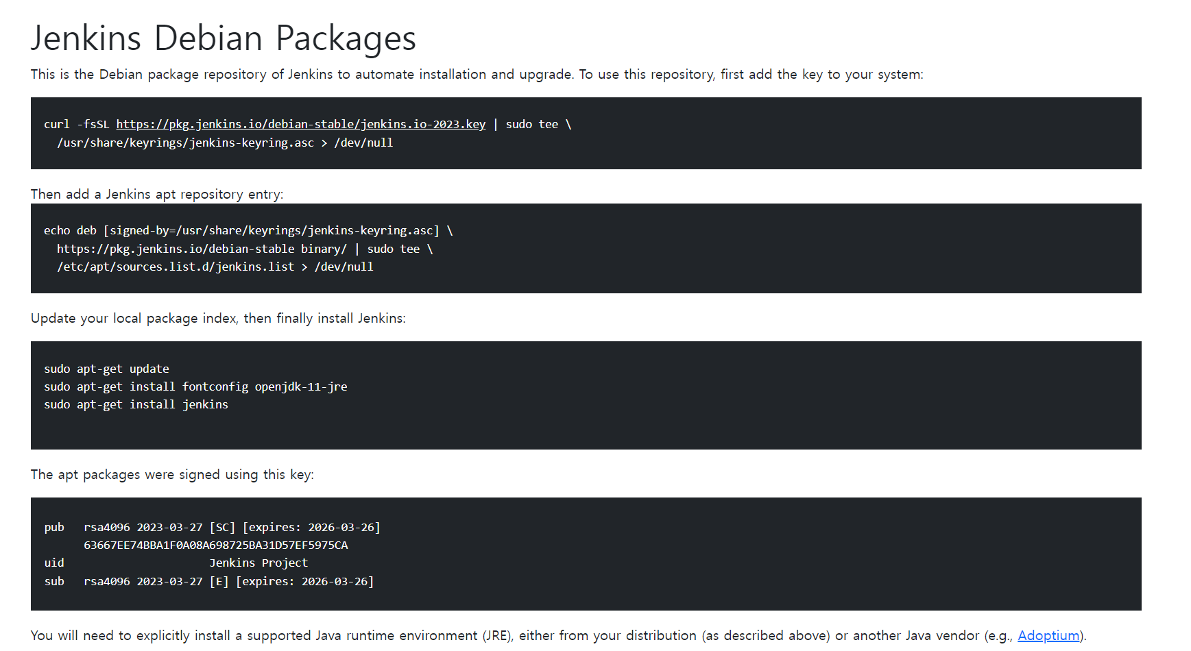 위와 같은 명령어들이 나오는데 이 명령어들을 순서대로 실행시키면 젠킨스가 설치된다.